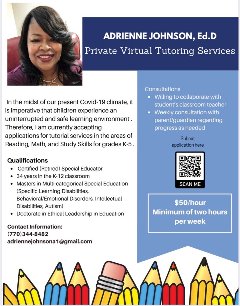 Dr. Adrienne Johnson is an experienced educational leader who has taught K-12 students in the area of Special Education for over 34 years. She has earned numerous degrees which include Bachelor’s and Master’s Degrees in Special Education and a Doctor of Education Degree in Ethical Leadership. As a recently retired teacher, Dr. Johnson currently provides private virtual tutoring services to students in the Atlanta area who have been impacted by school closures due to the Covid-19 pandemic.